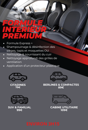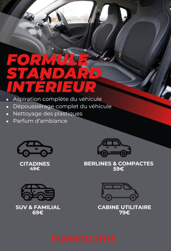 Aspiration complète, nettoyage des plastiques, tableau de bord, vitres intérieures et finitions soignées.